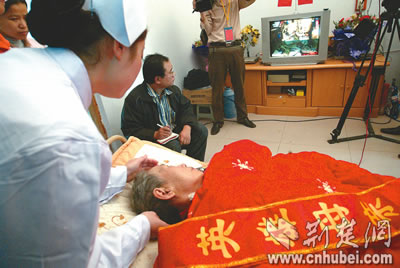 聶海勝家二樓的小客廳里,兩面墻壁上都掛著聶海勝身穿航天服的大幅照片。因病臥床一年之久的聶海勝的母親張金秀老人,此時被鮮花簇?fù),身上的被子上斜披著一條“英雄母親”的紅色綬帶,煞是醒目。