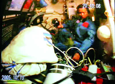聶海勝正在進行“穿艙”———從返回艙進入軌道艙。
