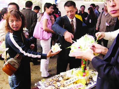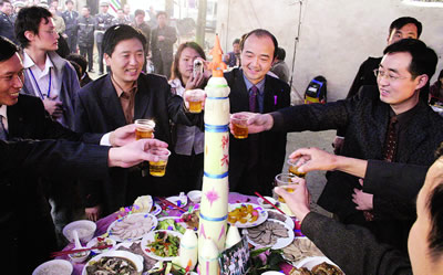 工作人員忙碌地張羅著。記者還發(fā)現(xiàn),在聶家新房前,新壘起了一個大磚灶,上面架一口大鐵鍋,鍋內熱氣騰騰。經(jīng)打聽得知,因擔心前來道賀的親友眾多,工作人員特意向當?shù)貜N師借來一口大鍋,用于煮長壽面。因鍋實在是太大,聶家沒有相應的灶能架住,于是人們在前日傍晚時分,臨時壘了這座灶臺。慶祝儀式結束后,記者上前打聽一共向這口大鍋里下了多少面條。兩名幫忙的鄉(xiāng)親說:“我們不停地在下面條,已經(jīng)記不清到底下了多少了!”他們還告訴記者,在當?shù)兀昭缛绱寺≈,天南海北的人如此眾多,如此受到關注,在楊垱鎮(zhèn)甚至在整個襄樊市“都應該是第一次”。