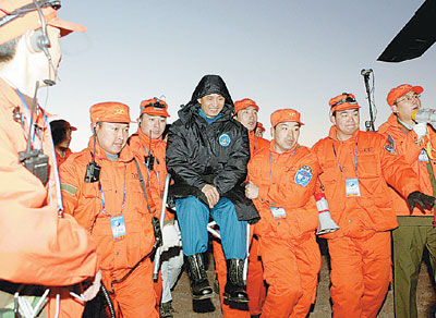 費(fèi)俊龍、聶海勝隔著舷窗,在向人們招手———返回艙內(nèi)柔和的燈光,映著他們的微笑。這一刻,距他們離開大地4天又19個(gè)多小時(shí),他們的總行程為325萬余公里。
