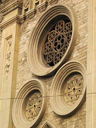 窗戶“合十”、“天圓地方”:古德寺窗戶的設(shè)計(jì)可謂別具一格。寶殿墻上可見(jiàn)三個(gè)一組的圓窗,分別為哥特風(fēng)格和中國(guó)的八卦圖;圓窗下是形如竹筍的花窗,象征著佛祖雙手合十的姿態(tài);回廊里的窗戶則上圓下方,取“天圓地方”之意。