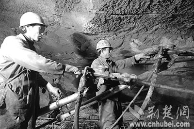 穿著雨衣的工人們手持風(fēng)槍,正在腳手架上下打爆破眼,山體里的水嘩啦啦直往下噴,然后順著挖好的水槽排向洞外,最多時(shí)一天要排3000立方米!斑@水算小的!”也許是察覺出我們眼神里的擔(dān)心,包秀峰輕松笑笑,仿佛一切都在他們掌控中。他甚至調(diào)侃說,“瞧,我們都穿皮鞋上班,施工環(huán)境沒你們想象中那么艱難!