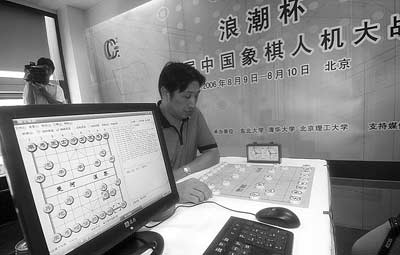 中國象棋特級大師柳大華在與計(jì)算機(jī)的對弈中。(新華社發(fā))