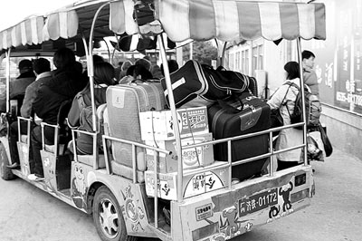 7日,幾名農(nóng)民工乘坐煙臺(tái)火車(chē)站的免費(fèi)電瓶車(chē)進(jìn)站。據(jù)介紹,從2005年12月24日開(kāi)始,煙臺(tái)火車(chē)站為返鄉(xiāng)的農(nóng)民工開(kāi)辟了“綠色通道”,為傷殘或行李較多的農(nóng)民工排憂解難。(新華社發(fā))
