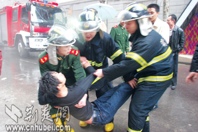 昨日上午,漢口青島路10號的鉆石酒吧在裝修中不慎引發(fā)火災(zāi),兩男子被困。危急關(guān)頭,消防兵破門而入,將二人救出。