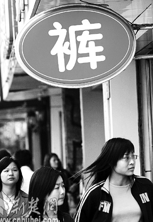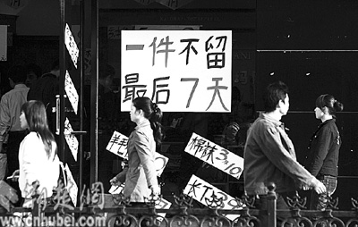昨日,武漢市江漢路某品牌商店用碩大的“褲”字吸引行人購(gòu)買(mǎi)欲(圖一)。在市場(chǎng)競(jìng)爭(zhēng)激烈的今天,“臉面”設(shè)計(jì)成為商家費(fèi)勁腦筋追逐的重心,但也有一些商家長(zhǎng)期打著“大甩賣”的旗號(hào)欺騙消費(fèi)者,頗煞風(fēng)景(圖二)。記者 張鴻 攝