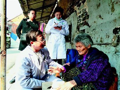 “耿婆婆好!我們來(lái)看您了?!痹谝蛔戏孔忧埃?6歲的耿良英老人正在曬太陽(yáng)。看到劉醫(yī)生,她手指著胸口說(shuō):“我的胃病又犯了,還頭暈,正想給你們打電話呢?!眲⑨t(yī)生仔細(xì)詢問(wèn),量體溫、測(cè)血壓,看老人體溫、血壓都正常,就叮囑老人按時(shí)服藥,并讓護(hù)士小尹在老人常備藥的包裝上寫清用法,隨后兩人繼續(xù)巡診。每月固定巡診兩次,隨時(shí)接受病人及家屬咨詢,緊急情況隨叫隨到。這是他們提供簽約家庭醫(yī)養(yǎng)服務(wù)內(nèi)容的標(biāo)配。