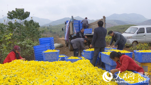 人民網(wǎng)通山11月15日電 深秋十一月,是秋菊的最佳采摘季節(jié)。近日,湖北通山縣燕廈鄉(xiāng)湖畔村和尚頭貢菊種植基地,那金黃色的花兒,忍不住秋天的誘惑競相開放。放眼望去,幾十位村民正在緊張忙碌采摘金黃的貢菊,田里一片繁忙的景象。
