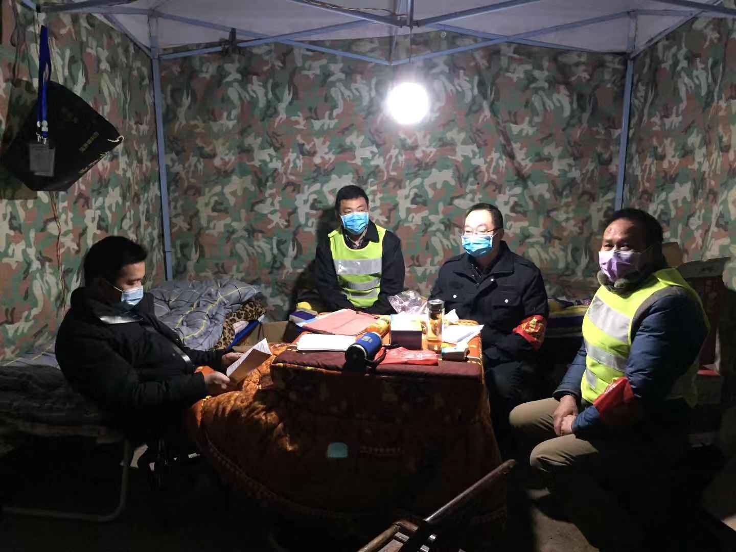 義源村的另一處臨時關(guān)卡點,16名黨員干部憑著幾把凳子,幾床被褥堅守陣 地,從1月25日開始, 24小時輪班執(zhí)勤,對外來人員車輛進行勸返消毒,嚴防死守, 為全村疫情防控工作構(gòu)筑了一道牢固的安全網(wǎng)、防護欄。