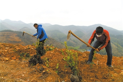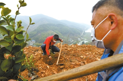 塘湖鎮(zhèn)閣壁村鳳形山上,在新開(kāi)墾的油茶基地里,幾十位工人戴著口罩正忙著打窩、放苗、培土。