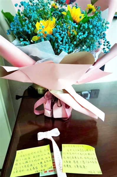 自稱為“云南小姐姐”的萬麗萍,將一束開得正艷的花和兩張小紙條擺在桌上?!坝窀纾遗路謩e時(shí)的淚崩,給你留了小紙條。咸寧的55天,感謝你無微不至的照顧,把我們一個(gè)個(gè)養(yǎng)得胖了一大圈。雖然回去要減肥,還是感恩、感謝!”