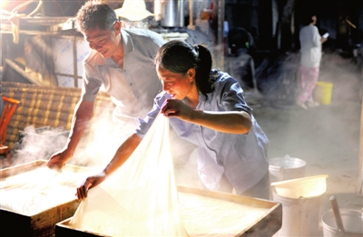 20日晚,崇陽縣高枧鄉(xiāng)中山村,楊仕典和黃連夫妻倆正在忙著打豆腐。夫妻倆本是金塘鎮(zhèn)黃沙村人,2008年舉家搬遷至這里做豆腐生意。