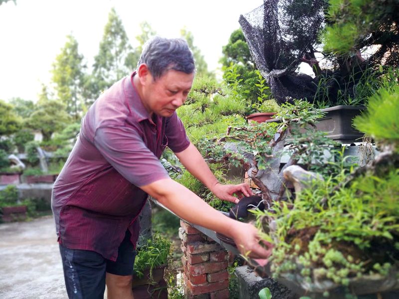 30多年來,孫勝望每天堅持下班后給盆景澆水,家里的走廊過道、院子里,平頂上密密麻麻全是擺放的盆景。最多時他的盆景達(dá)2000多盆,成了遠(yuǎn)近聞名的“盆景大戶”。僅澆水每天就要花費半天工夫,幾乎每個晚上他都要打著手電筒堅持把水澆完?!皾菜孟蠼o嬰兒喂水,施肥好比喂奶,修枝好比剪指甲,而打農(nóng)藥則是給他們治病……”在他心目中,每一個盆景都是一個嗷嗷待哺的嬰兒,孫勝望總是悉心照料,精心呵護。