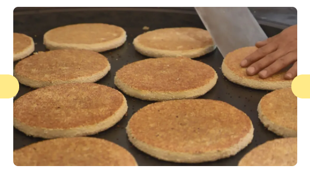 麻餅在制作前,先要炒好芝麻,炒好的芝麻倒進竹匾,其香味隔著鏡頭似乎都能聞得到。用各色干果仁、加上冰糖、陳皮、金錢桔等,十幾種食料破碎攪拌而成的餡料被搓好了,面團也被分成適量的面劑,再將搓好的餡料包進去,在鐵箍模具中,用木柄敲打延展和切削定型。