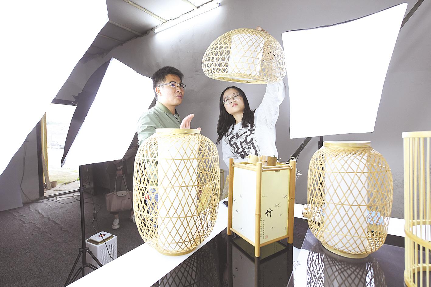 10月14日,咸寧市咸安區(qū)大幕鄉(xiāng)雙垅村竹雕藝人在攝影棚向客人介紹竹制家居用品和工藝品。去年5月,當(dāng)?shù)卮髮W(xué)畢業(yè)生賀慈回鄉(xiāng)創(chuàng)業(yè),成立藝竹情工藝品公司,聘請(qǐng)民間藝人手工制作工藝品,通過(guò)電商銷售,今年前三季度銷售額500多萬(wàn)元。