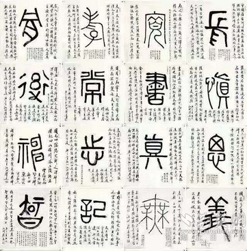 在創(chuàng)作中,陳履生用接近現(xiàn)代繪畫的方式,將字的主體以篆書寫在中心位置,周圍以行書題跋書寫注釋、個人感悟等相關(guān)內(nèi)容,強化對這個字的認識過程,讓人有更深刻的理解。如開篇第二字“義”字的題跋,除了引用古籍中對義字的解讀,還加入了一句“時在國家多事之時,義士善舉皆多”的感悟,與當時“大疫當前有大義”的情境十分貼合。