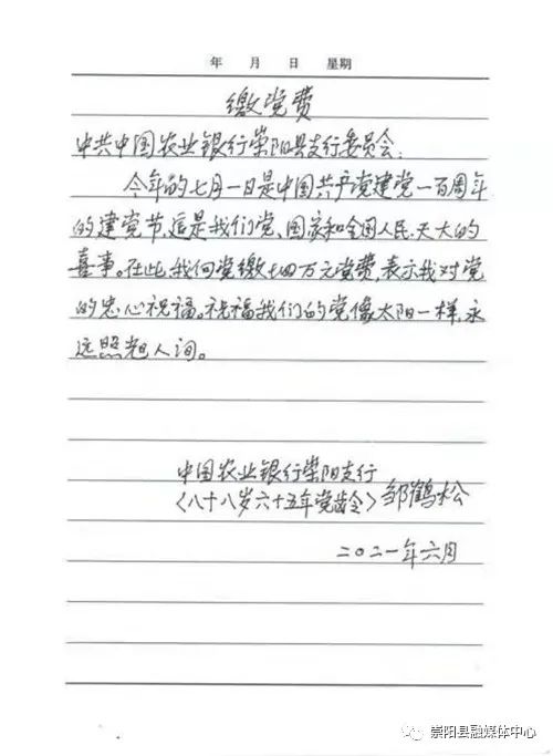 廖海峰告訴記者,來之前,鄒鶴松老人特意向中國農(nóng)業(yè)銀行崇陽支行黨委寫了一封信,信里這樣寫著:“今年是中國共產(chǎn)黨建黨100周年,這是我們黨、國家和全國人民天大的喜事。在此,我向黨繳納4萬元黨費,表示我對黨的衷心祝福。祝福我們的黨像太陽一樣,永遠照耀人間。”一句句簡單樸實的語言,彰顯著一名老黨員赤心向黨、一心為黨樸實而偉大的情懷。
