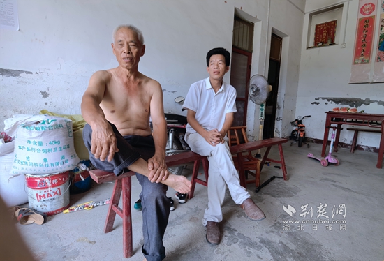 柳紅旗(右)與老黨員舒菊良(左)交流鄉(xiāng)村治理。 記者 田城 攝