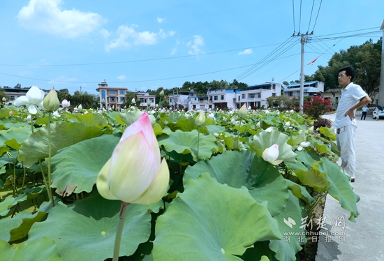 漫步在9組,17戶人家,家家戶戶門口都有一個“口袋花園”,觀賞花木,假山流水,不一而足;灣組中央盆地,“紅旗園林”已經(jīng)成型,風(fēng)吹柳樹,萬條絲絳隨風(fēng)而動,不遠(yuǎn)處,藍(lán)天白云籠罩下,400畝蓮藕基地中荷花正盛,粉的、白的、青的花瓣被層層疊疊碩大的荷葉襯托著,“美得一塌糊涂”。