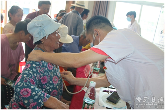 當天恰逢“大暑”,烈日炎炎,山路崎嶇,隊員們穿著白大褂、志愿者馬甲,攜帶診療設(shè)備、健康資料,到達黨員活動中心時已經(jīng)汗流浹背,但他們顧不上喝一口水,立即各司其職:義診、量血壓、測血糖、按需贈送藥品,志愿者們忙著維護秩序,引導(dǎo)大家保持適當距離,幫扶行動不便的老人。