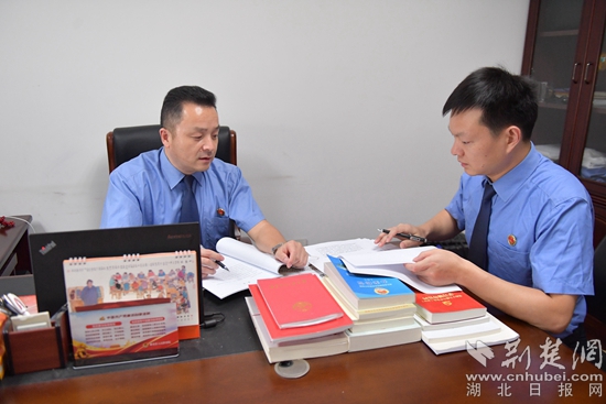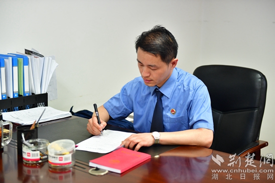 “他對(duì)待工作認(rèn)真細(xì)致?!薄八恢痹谵k案一線?!薄八俏以阂幻嬉倭⒉坏沟募t旗?!蓖驴谥泻迷u(píng)不斷的他,是蘄春縣檢察院第三檢察部主任袁國(guó)斌,一名退伍老兵。