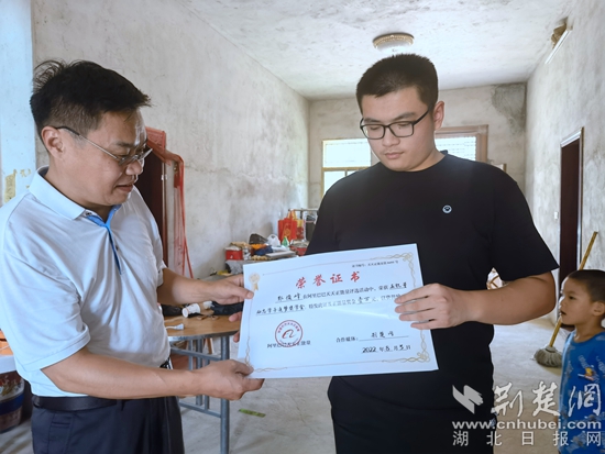 剛吃完飯,中午一時(shí)許,鄂州市勞動(dòng)就業(yè)服務(wù)中心副主任、駐郭檔村第一書記曾勝,郭檔村黨支部副書記郭細(xì)崇等人趕往郭俊峰家中,將“阿里巴巴天天正能量”的獲獎(jiǎng)證書送給郭俊峰。