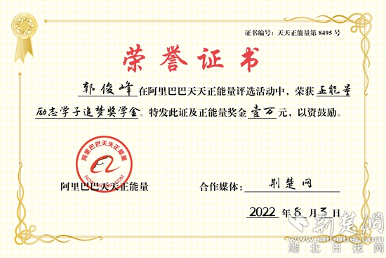 阿里巴巴正能量勵(lì)志學(xué)子追夢獎(jiǎng)團(tuán)隊(duì)專門為郭俊峰定制了頒獎(jiǎng)詞:12歲,父母雙雙溺亡,晴天霹靂,擊中了這個(gè)原本幸福富裕的家。來不及裝修的毛坯房里,四面灰撲撲的墻,籠住了一顆幼小破碎的心。18歲,少年高分錄取,八旬奶奶,多少含辛茹苦終于得到回報(bào)。她走街串巷,片片綠油油的菜葉,換回少年夢想的門票。祖孫倆相依為命,這一路,有多難,已無需贅言。老淚縱橫,只因多年期盼,終得圓滿。阿里巴巴天天正能量聯(lián)合荊楚網(wǎng)為郭俊峰頒發(fā)正能量勵(lì)志學(xué)子追夢獎(jiǎng)學(xué)金一萬元,這是少年成年的日子,也是一段磨難的休止。新的起點(diǎn),愿他更上一層樓,回報(bào)奶奶,回報(bào)社會。