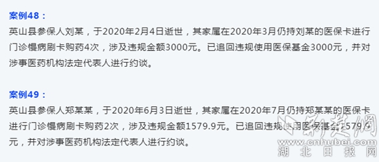 荊楚網(wǎng)(湖北日?qǐng)?bào)網(wǎng))訊(記者 金康)9月1日,英山縣醫(yī)療保障局曝光“三假”案列,49名逝世者家屬仍持死者醫(yī)??ㄟM(jìn)行門(mén)診慢病刷卡購(gòu)藥。目前,該局已全部追回違規(guī)使用醫(yī)?;?,并對(duì)涉事醫(yī)藥機(jī)構(gòu)法定代表人進(jìn)行約談。