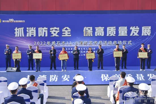 啟動儀式上,黃石市消防救援支隊支隊長程雄鷹部署了消防宣傳月相關(guān)工作,市委宣傳部副部長丁元拾宣讀了《關(guān)于表彰全市優(yōu)秀消防志愿服務(wù)團隊和消防宣傳志愿者的通報》,與會領(lǐng)導(dǎo)為獲獎團隊和個人代表頒發(fā)了獎牌及證書。