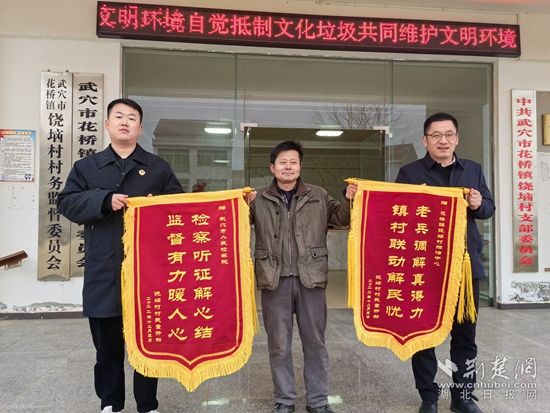 荊楚網(wǎng)(湖北日報網(wǎng))訊(通訊員 耿文輝 趙兆)“老兵調(diào)解真得力,鎮(zhèn)村聯(lián)動解民憂”“檢察聽證解心結(jié),監(jiān)督有力暖人心”,12月27日,信訪戶董某甲將兩面錦旗分別送給武穴市人民檢察院和武穴市花橋鎮(zhèn)饒垴村綜治中心。
