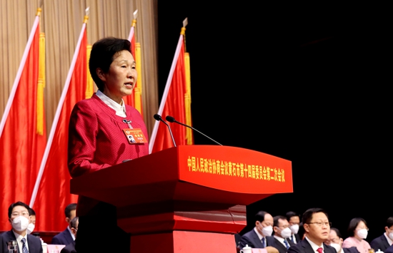 周蔚芬作《中國人民政治協(xié)商會議黃石市第十四屆委員會常務(wù)委員會工作報告》。阮瓊 攝