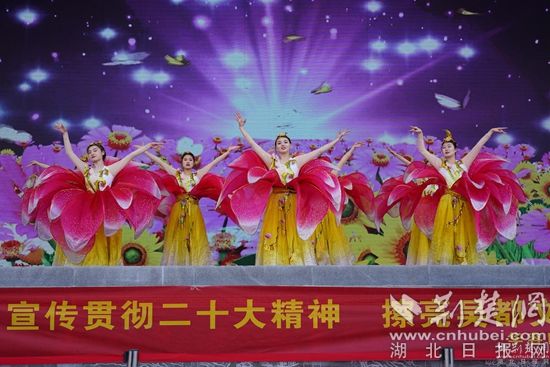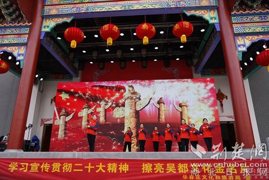 新春廟會將黨的二十大宣講、文藝演出與民俗表演相結合,開場舞蹈《荊楚歡歌》、湖北大鼓《二十大精神放光芒》、詩朗誦《航程》、反串《長袖舞》、男聲獨唱《我和我的祖國》等文藝節(jié)目和傳統(tǒng)的舞獅、雜技、魔術等老百姓喜聞樂見的表演在廟會現(xiàn)場輪番上演。