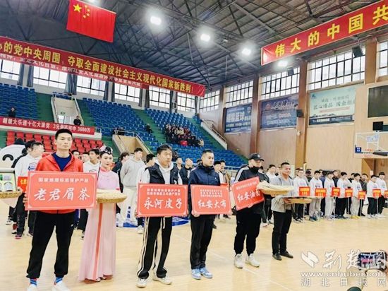 頒獎儀式上,國家地理標(biāo)志保護(hù)產(chǎn)品紅安苕、老君眉茶,國家級非遺代表性項目紅安繡活,國家地理標(biāo)志保護(hù)產(chǎn)品、國家地理標(biāo)志商標(biāo)、省級非遺代表性項目紅安大布傳統(tǒng)紡織技藝產(chǎn)品,省級非遺代表性項目紅安油面,市級非遺代表性項目永河皮子、綠豆粑作為大賽獎品相繼亮相,既接地氣,又有人氣,村味十足。