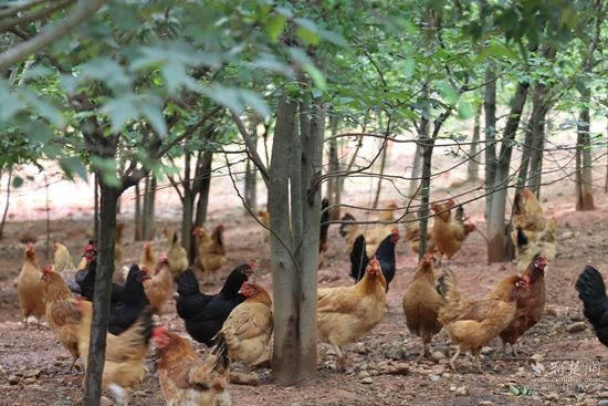 走在梓沐家庭農(nóng)場里,綠樹成蔭,微風(fēng)習(xí)習(xí)?!斑@是茶梅路,那邊一條是桂花路,中間種的是三角楓,桂花路另一邊是樸樹以及一些果樹?!蓖踔窃竭呑哌吔榻B,農(nóng)場充分利用空間發(fā)展林下經(jīng)濟(jì),單獨(dú)劃分區(qū)域,在樹下放養(yǎng)雞鴨共計(jì)1000余只。