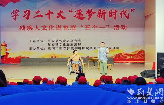 在文化館演出廳,楚劇團(tuán)為殘疾人帶來了文化盛宴。大型舞蹈《花開盛世》、女聲獨(dú)唱《好人就在身邊》、楚劇小品《鹽紅》、舞蹈《床前明月光》、男聲獨(dú)唱《這一拜》、方言小品《薯你有味》、女聲獨(dú)唱《天耀中華》、大型舞蹈《請到紅安來游玩》等節(jié)目。