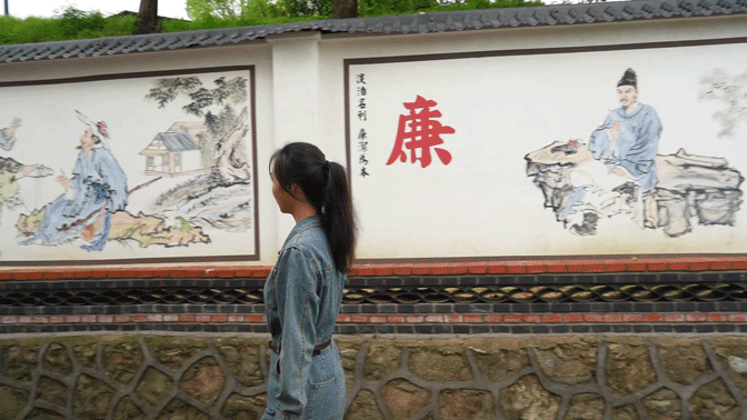 將農(nóng)具鑲嵌在墻上村民休憩的長(zhǎng)廊與涼亭