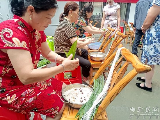 “先卷起粽葉,再填滿米,加蜜棗,再封口系繩,力道要適中?!痹诎兆訁^(qū)域,村民張嫂子作為巾幗志愿者非常耐心地教孩子包粽子。孩子們拿著粽葉幫忙放糯米,學(xué)得有模有樣。半個小時后,粽葉、糯米、粽繩等材料變成一個個棱角分明的棕子。