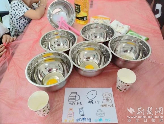 雞蛋、牛奶、面粉、白糖……在志愿者們的指導(dǎo)下,小朋友們添加食材、攪拌,現(xiàn)場(chǎng)井井有條。孩子們盡情享受“創(chuàng)造”的過(guò)程,不到一會(huì)時(shí)間,一塊塊香氣四溢的小蛋糕就端上了桌。