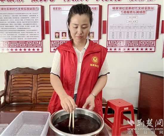 活動開始前,社區(qū)網(wǎng)格員準備好冰塊、水杯,著手將配置好的酸梅湯燒制起來,并清洗好鍋盆、綠豆,加入冰糖,慢慢熬燉“愛心綠豆湯”。