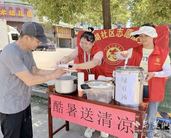 活動現(xiàn)場,社區(qū)工作人員在菜市場路口提前設(shè)置好清涼桌,將準備好兩大桶的綠豆湯和涼茶,發(fā)放給高溫下的工作者和路過的居民。同時,為他們科普防暑降溫知識,叮囑他們注意休息和避暑。