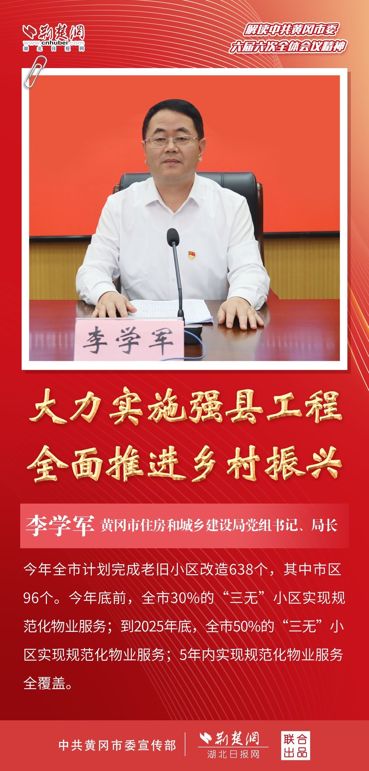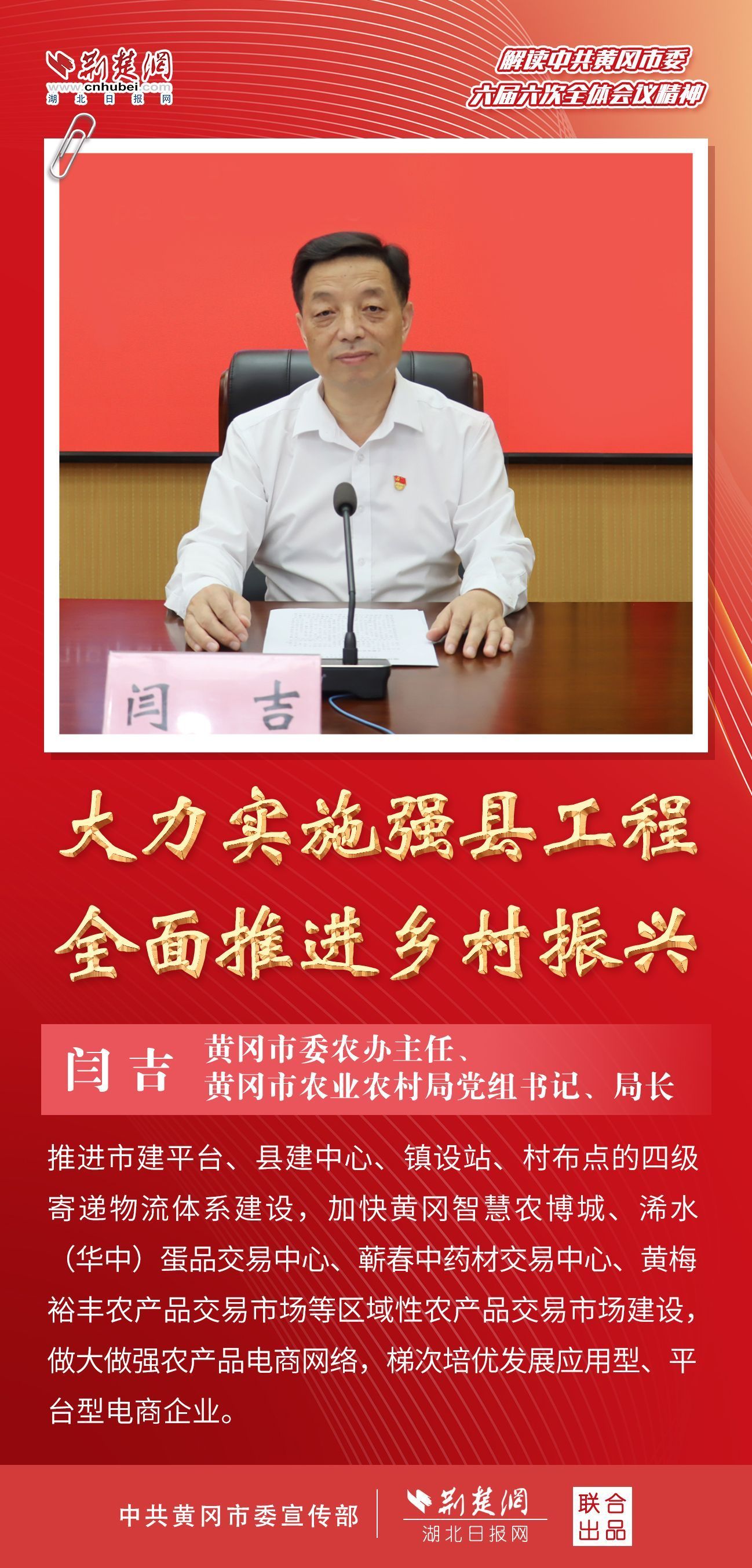 隨后,黃岡市住房和城鄉(xiāng)建設(shè)局、市經(jīng)濟(jì)和信息化局、市農(nóng)業(yè)農(nóng)村局主要負(fù)責(zé)人分別圍繞“‘四區(qū)聯(lián)動(dòng)’城市更新”“推進(jìn)制造強(qiáng)縣 培育特色產(chǎn)業(yè)集群”和“強(qiáng)化供應(yīng)鏈思維 推動(dòng)農(nóng)業(yè)產(chǎn)業(yè)轉(zhuǎn)型升級(jí)”等內(nèi)容作主題發(fā)布。
