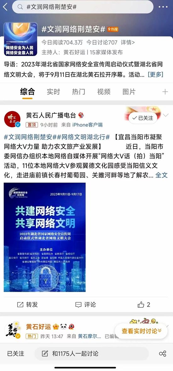 荊楚網(wǎng)(湖北日?qǐng)?bào)網(wǎng))訊(記者 呂鑒蕾 通訊員 黃旺宣)2023年湖北省國(guó)家網(wǎng)絡(luò)安全宣傳周啟動(dòng)儀式暨湖北省網(wǎng)絡(luò)文明大會(huì)開(kāi)幕在即。連日來(lái),圍繞“文潤(rùn)網(wǎng)絡(luò)荊楚安”“網(wǎng)絡(luò)文明湖北行”等話題,社交平臺(tái)上開(kāi)啟了“湖北接力”。