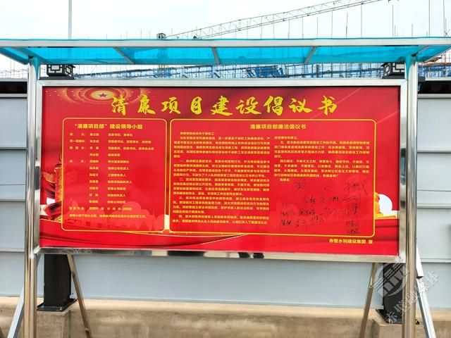 赤壁中試谷·智能無人系統(tǒng)測試基地赤壁市水建集團項目部前的清廉項目建設倡議書的簽名板上,密密麻麻地簽滿了名字。一個簽名就是一份承諾,一個簽名就是一份責任,一個簽名就是水建集團建設清廉國企的堅實基礎。
