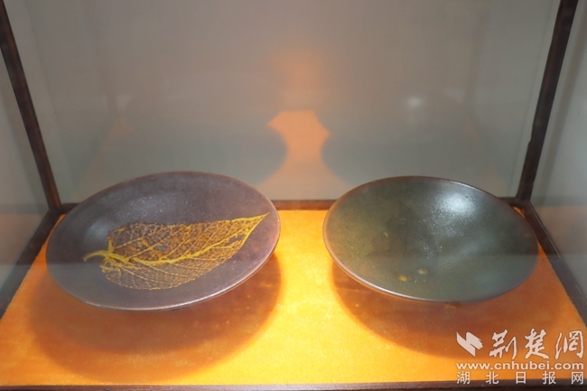 將天然樹(shù)葉燒制于盞上,盞里倒上水,盞內(nèi)木葉莖脈清晰,或卷或舒,仿若在水中漂。在工作室,何登明向記者展示著他的得意之作——仿宋吉州窯木葉盞。