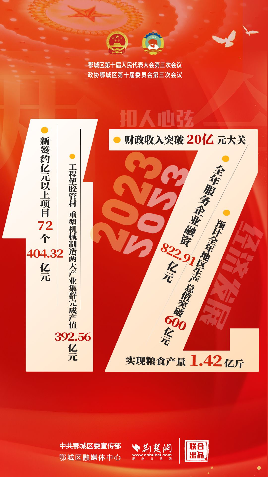 “億”解釋:2023年經(jīng)濟社會發(fā)展中,新簽約億元以上項目72個404.32億元,工程塑膠管材、重型機械制造兩大產(chǎn)業(yè)集群完成產(chǎn)值392.56億元,全年服務企業(yè)融資822.91億元,實現(xiàn)糧食產(chǎn)量1.42億斤,預計全年地區(qū)生產(chǎn)總值突破600億元,財政收入突破20億元,全區(qū)民生投入21.6億元。