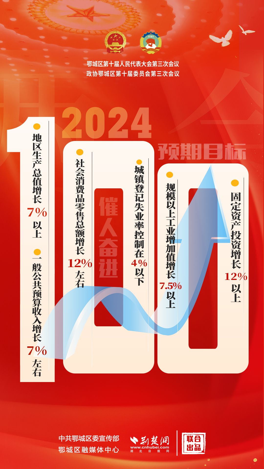 “100”解釋:2024年經(jīng)濟社會發(fā)展主要預期目標是,地區(qū)生產(chǎn)總值增長7%以上,一般公共預算收入增長7%左右,社會消費品零售總額增長12%左右,城鎮(zhèn)登記失業(yè)率控制在4%以下,規(guī)模以上工業(yè)增加值增長7.5%以上,固定資產(chǎn)投資增長12%以上,服務業(yè)增加值增長7.5%左右。