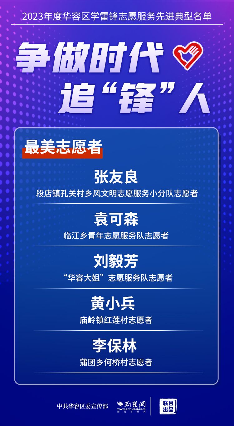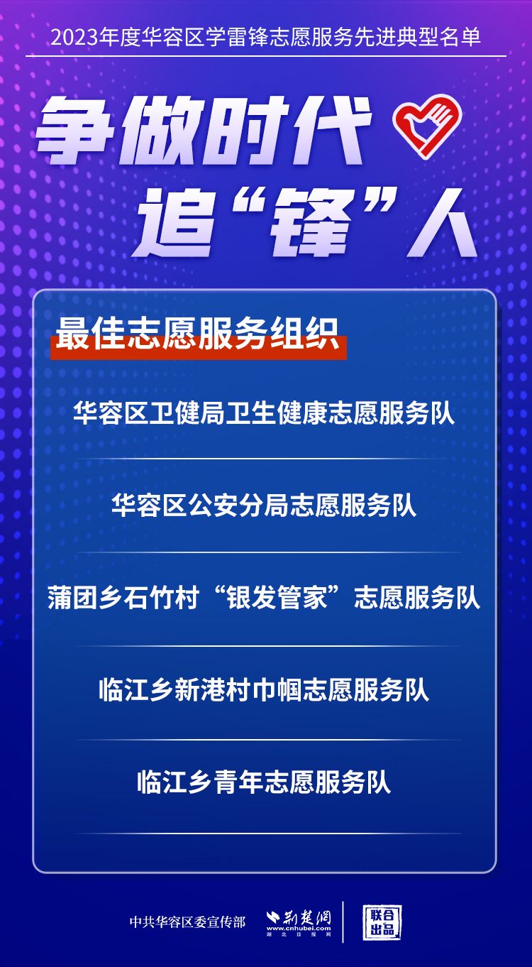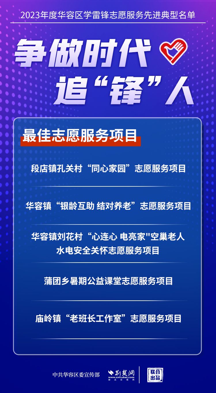 荊楚網(湖北日報網)訊(記者王焱堯 通訊員劉佳源)最美志愿者、最佳志愿服務組織、最佳志愿服務項目、最美志愿家庭……3月5日,武漢新城展示中心,鄂州市華容區(qū)公布2023年度學雷鋒志愿服務先進典型名單。