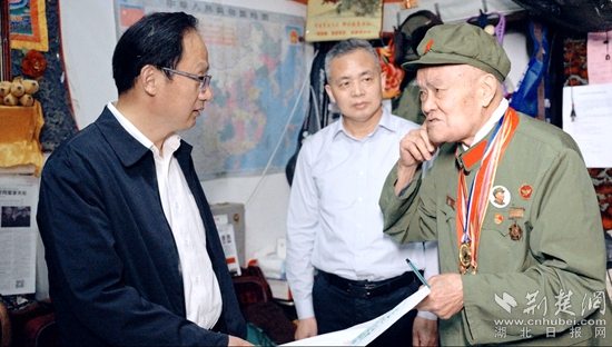 當(dāng)天上午,黃石市委宣傳部副部長(zhǎng)、市委網(wǎng)信辦主任萬(wàn)金光,黃石市退役軍人事務(wù)局黨組書記、局長(zhǎng)陳鵬圖一行參加啟動(dòng)儀式,并前往抗美援朝老戰(zhàn)士瞿介昌住處看望。他們向瞿介昌老戰(zhàn)士簡(jiǎn)單介紹了本次主題報(bào)道情況,向這位老英雄獻(xiàn)上了鮮花,表達(dá)了對(duì)退役軍人的敬意,并為“致敬英雄”采訪團(tuán)授旗。