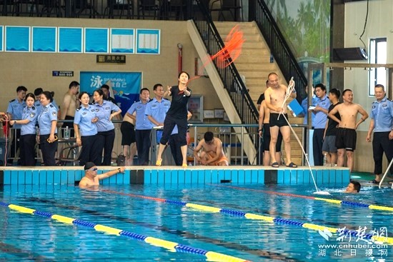 來到游泳館,市級教官、交管局車管所副所長、二級警長劉思杰現(xiàn)場培訓(xùn)救生桿、救生圈、救生繩、救生衣等救援器材規(guī)范操作,并下水操作展示涉水救援處置流程、救援器材使用等專業(yè)技能。