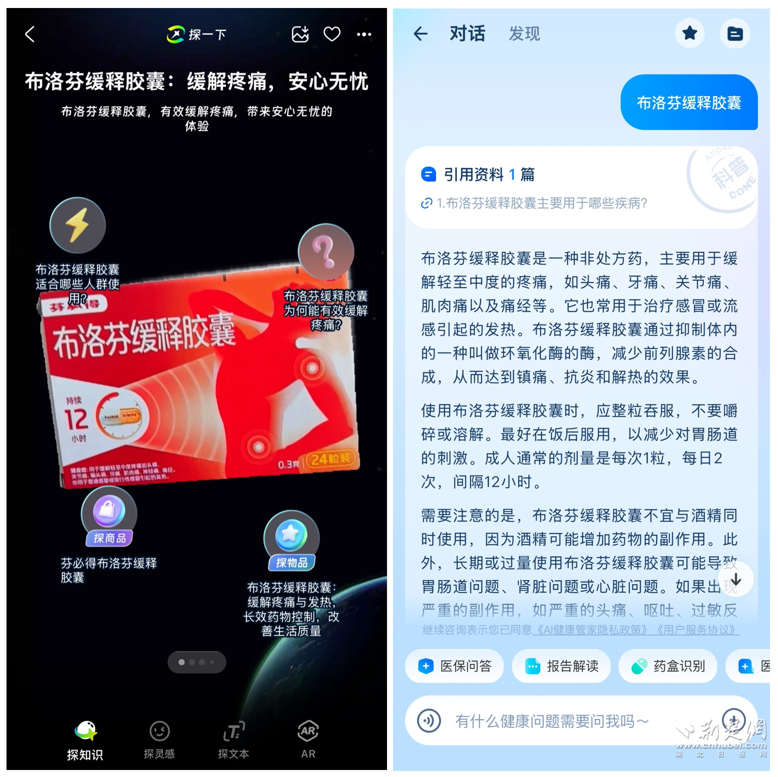 遇到讀不懂的外文商品,探一下就能獲取詳情,更方便線上買同款;家里丟了說明書的藥盒,不僅可查到詳細(xì)介紹,還能調(diào)用支付寶旗下“AI健康管家”追問更多的用藥須知。